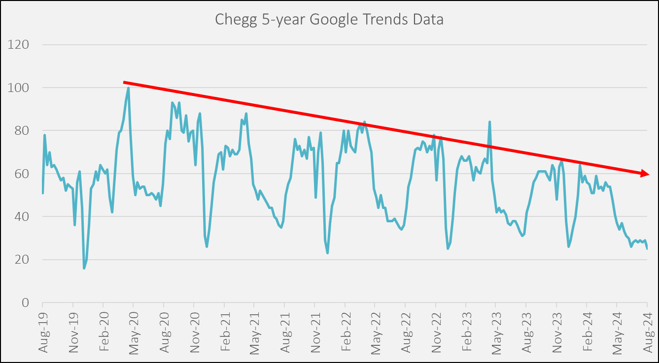 Google Trends paints a great picture of how the demand for Chegg has changed in the last 5 years.