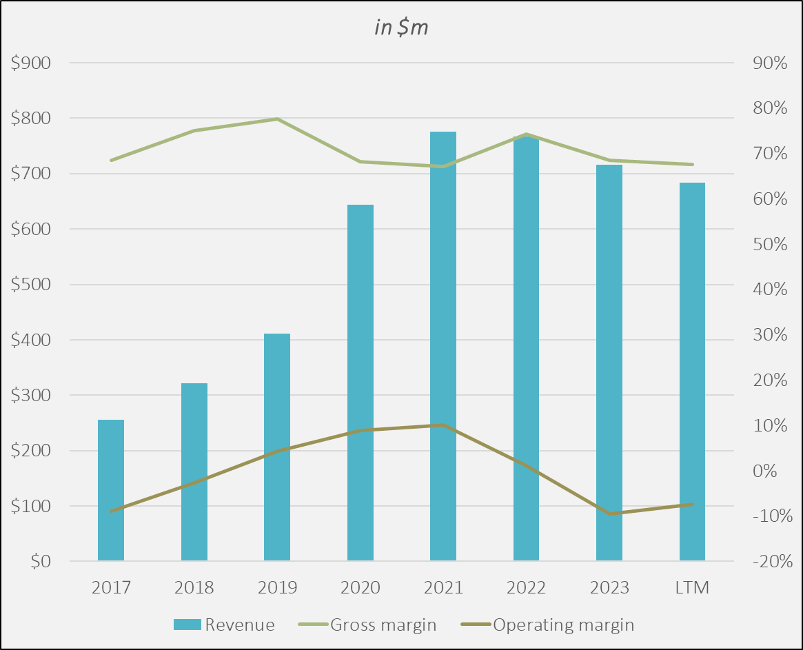 Except for the pandemic period, the company is struggling to find its way to operating profitability, despite the ~70% gross margin.