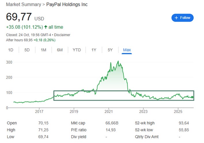 PayPal is called “dead money” because its share price today is pretty much where it was 8 years ago.